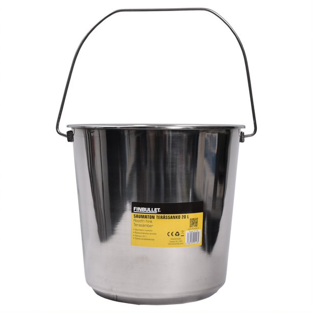 Terässanko ruostumattomasta teräksestä on tilavuudeltaan 20 litraa. Saumaton sanko on monikäyttöinen ämpäri jokaiseen kotiin. Hygieeninen sanko on varustettu kestävällä ja tukevalla kantokahvalla. Tyylikäs terässanko soveltuu kestävyytensä ja materiaalinsa ansiosta niin sisä- kuin ulkokäyttöön. Ämpärillä on pitkä käyttöikä niin maatilalla, autotallissa, mökillä kuin kotonakin. Terässanko soveltuu moneen eri tarpeeseen, kuten pesusankoksi, tuhkaämpäriksi tai meriveden kestäväksi ämpäriksi veneeseen.