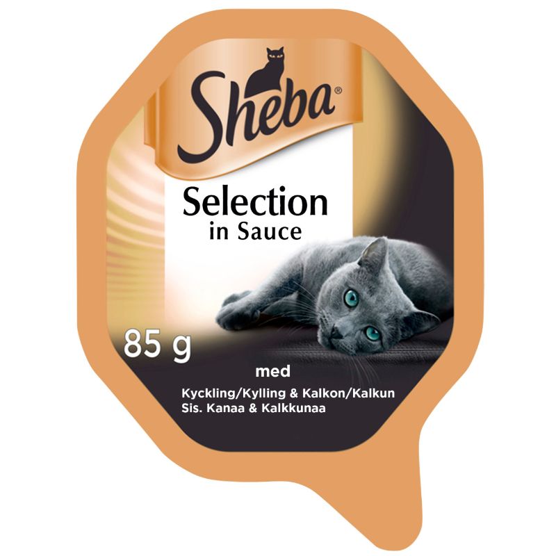 Sheba® Selection in Sauce tarjoaa kissallesi herkullisella reseptillä valmistetun annosaterian, joissa mureat kanan ja kalkkunan palat yhdistyvät houkuttelevaan kastikkeeseen.