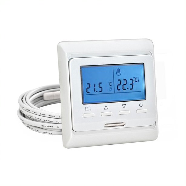 Digitaalinäyttöinen termostaatti joka sopii yhteen erityisesti lattialämmitysmaton kanssa.