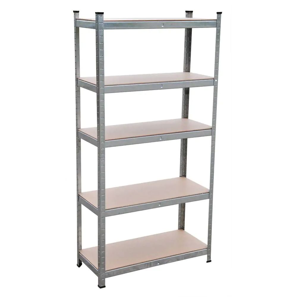 Tukeva 5-hyllyn varastohylly, teräsrunko ja mdf-levyt. Kantavuus 175 kg. Korkeus 180 cm, leveys 90 cm, syvyys 40 cm.