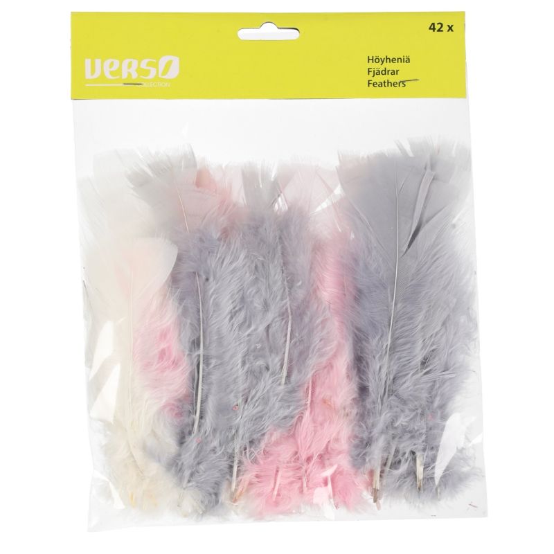 Kauniin väriset höyhenet askarteluun, koristeluun ja virpomisoksiin! Myydään 42kpl / pussi. Höyhenten värit roosa, valkoinen ja harmaa.