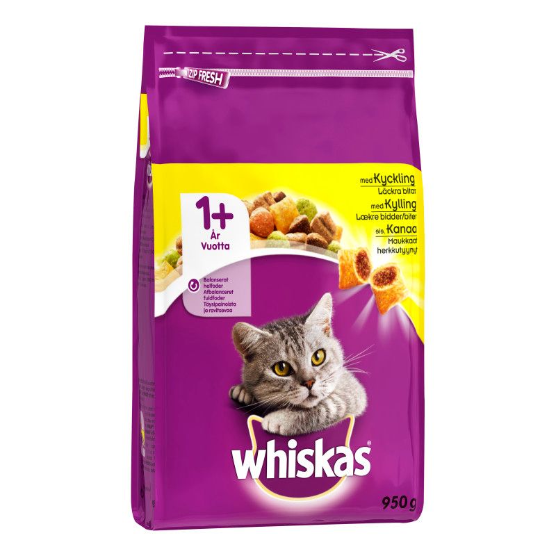 Whiskas® ymmärtää kissasi luonnolliset tarpeet ja mieliteot. Siksi Whiskas® 1+ on täysipainoinen ja ravitseva ruoka, joka tarjoaa tasapainoisessa suhteessa vitamiineja ja kivennäisaineita ja antaa aikuiselle kissallesi parhaan mahdollisen huolenpidon. Auttaa puhdistamaan hampaat hankaamalla hellästi.