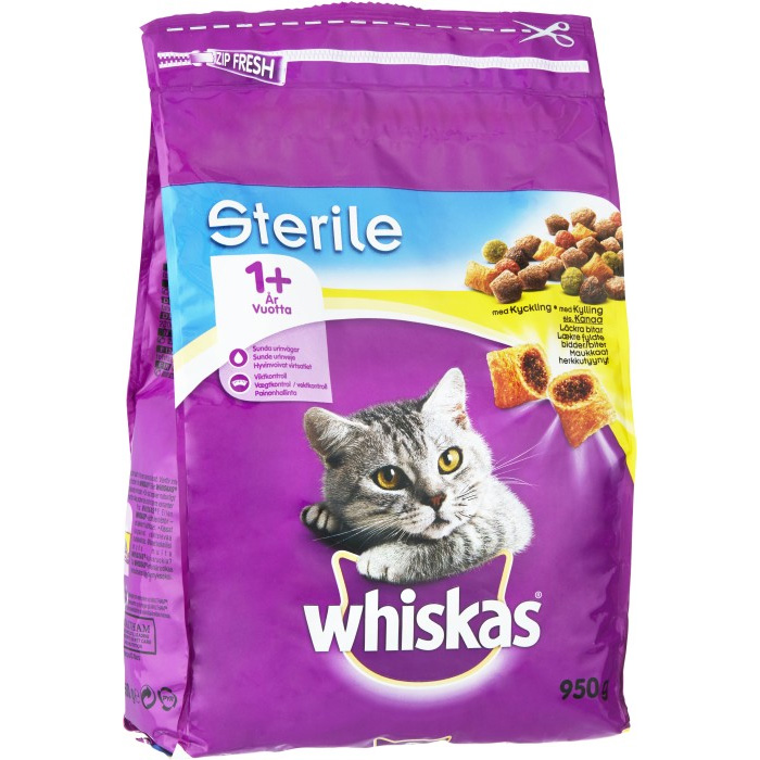 Whiskas Sterile täyttää leikattujen kissojen ruokavaliovaatimukset tukien samalla virtsateiden terveyttä sekä auttaen painonhallinnassa.