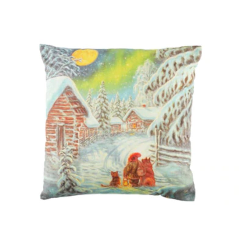 - Lämmintä joulun tunnelmaa henkivässä sohvatyynyssä nostalginen kuva maaseudun pihapiiriä tarkkailevasta tontusta talviyönä.